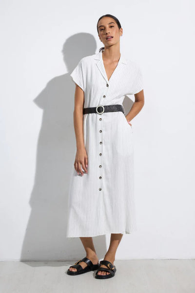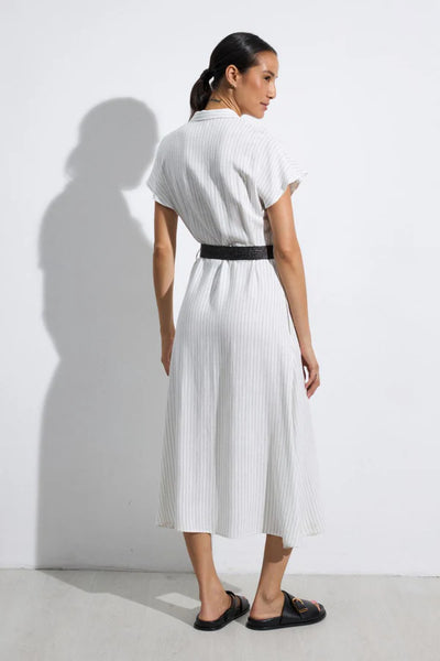 Vertical pinstripe trim adds subtle visual interest, while the straight midi hem creates a flattering, timeless silhouette