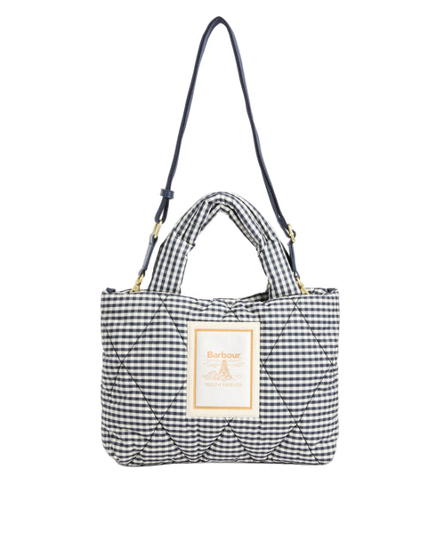 Featuring a distinctive quilted gingham check design with XL diamond quilting, this compact tote offers versatile carrying options with padded grab handles and a detachable shoulder strap