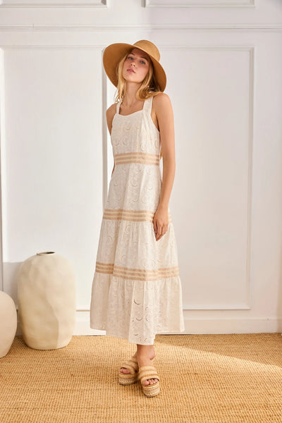 Elegant long dress crafted from 100% cotton, featuring distinctive wide straps that cross gracefully at the back