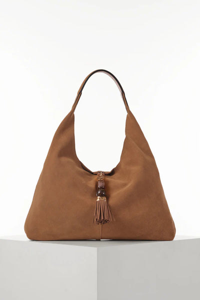 Indulge in effortless elegance with the Camel Pandora Bag, a sumptuous hobo crafted from genuine suede