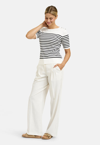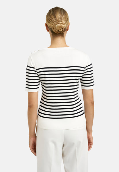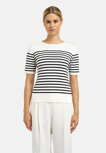 - Crafted from a luxurious viscose and elastane blend, it features a classic crew neck, short sleeves, and distinctive three-button shoulder detail