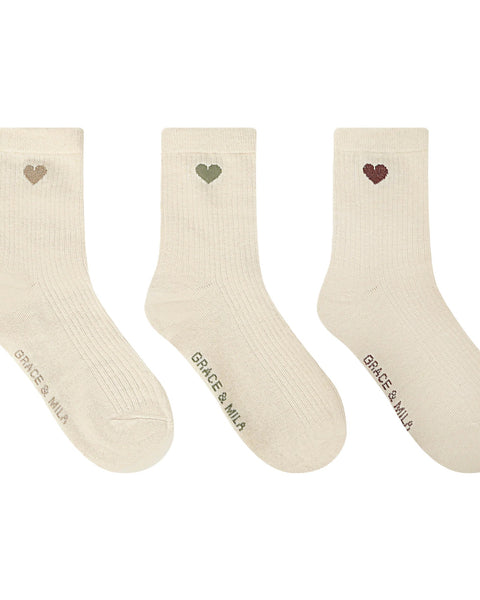 Socks are made from an ecru ribbed knit and decorated with a coloured lurex heart