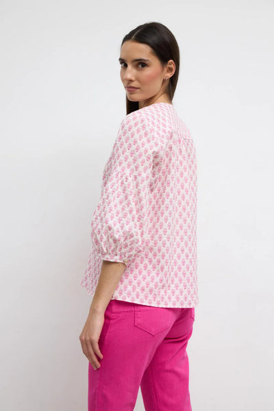 Elevate your everyday style with this charming three-quarter puff sleeve blouse, crafted in Spain from a breathable cotton-elastane blend