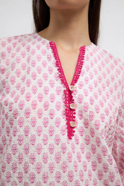 The mandarin collar and tunic neckline create a refined silhouette, while the mini floral print with vibrant fuchsia trim adds a playful pop of colour to the chest