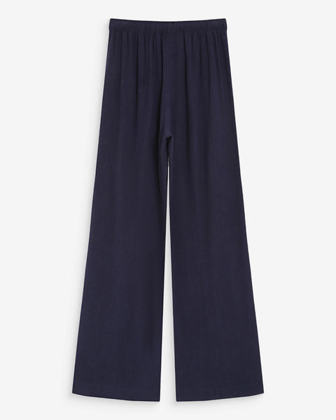 - Wide leg trousers made from a linen blend fabric is simple and modern